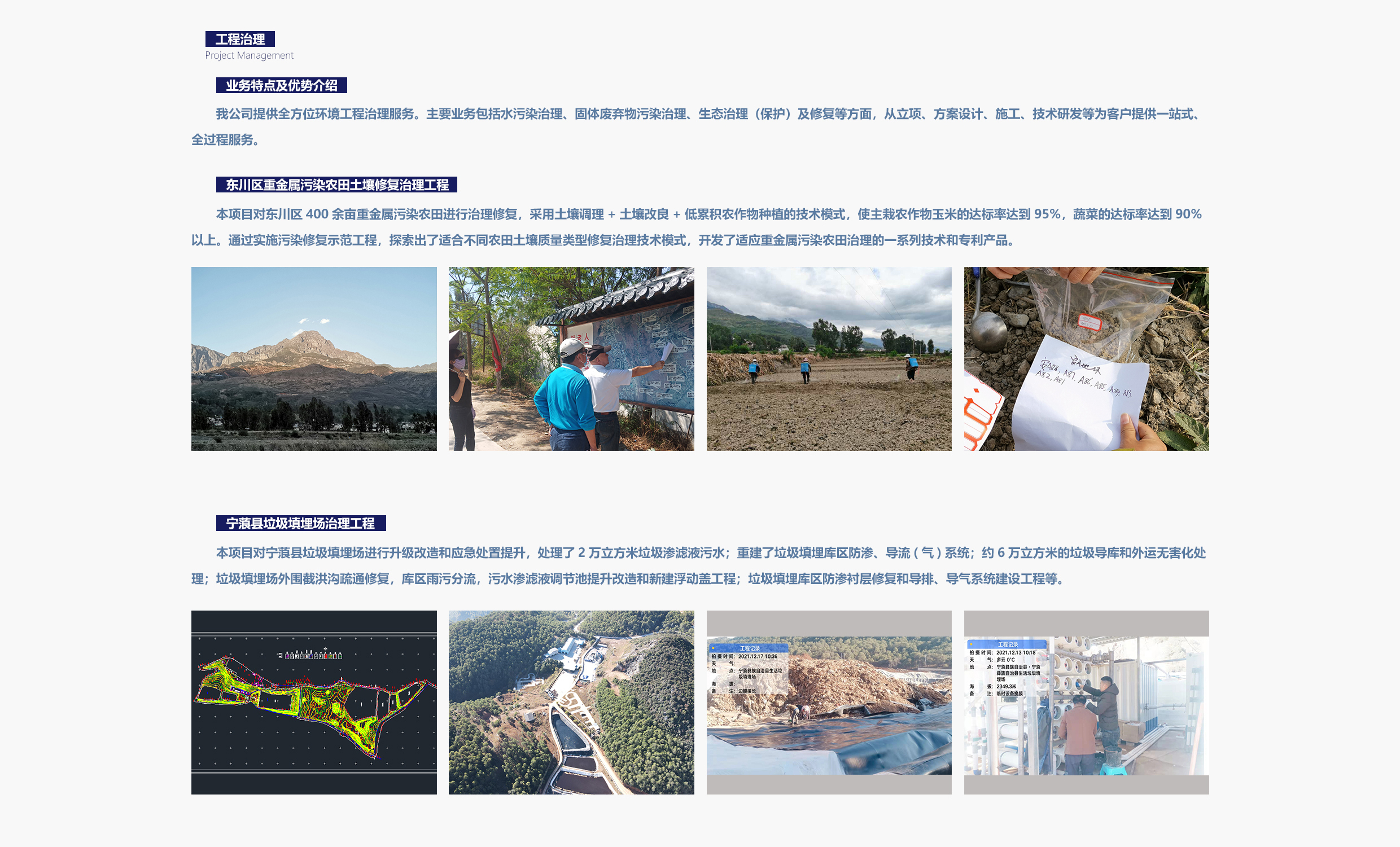 綜合服務(wù)項目業(yè)績覆蓋生活垃圾及固廢處理處置、流域水環(huán)境綜合治理、農(nóng)村環(huán)境綜合治理、工業(yè)污染場地、農(nóng)用耕地土壤修復(fù)和礦山生態(tài)修復(fù)等領(lǐng)域。具有“環(huán)保工程專業(yè)承包三級”資質(zhì),獲得質(zhì)量管理體系、AAA企業(yè)信用等級、國家及云南省科技型中小企業(yè)等證書,并取得16項專利。