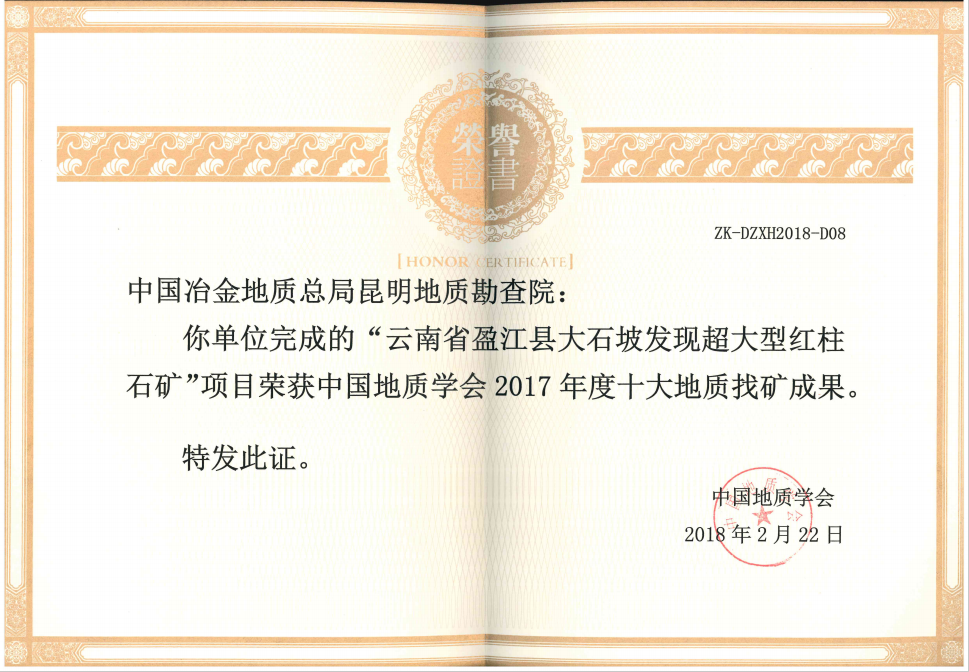 2018年2月22日,昆明地質(zhì)勘查院完成的“云南省盈江縣大石坡超大型紅柱石礦”項(xiàng)目獲得中國地質(zhì)學(xué)會2017年度“十大地質(zhì)科技進(jìn)展、十大地質(zhì)找礦成果”獎。