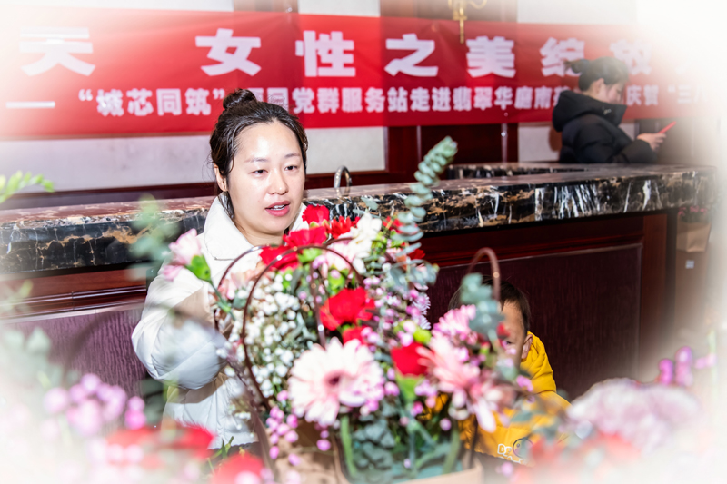 活動現場氣氛熱烈而融洽,居民們邊向老師學習邊交流,互相分享自己的插花心得。一朵朵美麗的花朵在大家的手中綻放,仿佛也在訴說著女性的堅韌與美麗。