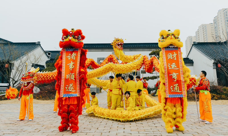 隨著激昂的鑼鼓聲響起,兩條金色巨龍和威風(fēng)凜凜的醒獅閃亮登場(chǎng)。舞龍者們步伐矯健,巨龍?jiān)谒麄兊奈鑴?dòng)下時(shí)而盤旋,時(shí)而騰飛,身姿矯健,氣勢(shì)磅礴。醒獅更是靈動(dòng)活潑,高高躍起,精準(zhǔn)地叼取懸掛在空中寫有“財(cái)運(yùn)亨通,諸事順?biāo)?rdquo;的對(duì)聯(lián),寓意著將財(cái)運(yùn)和福氣傳遞給現(xiàn)場(chǎng)的每一個(gè)人,引得觀眾陣陣歡呼。